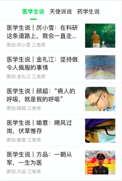 的三个不同专业:临床医学、护理学、药学,开辟了三个对应栏目:①“医学生说”,邀请临床医学专业的毕业生来讲述成长经历,如嘉兴市第一医院呼吸内科医生顾超、金华市中心医院小儿外科医生孙林峰、汕头市中心医院神经外科医生陈颖高等。②“天使诉说”,因护士常被誉为“白衣天使”,所以邀请了护理专业的毕业生来讲述成长经历,如考入复旦大学硕士研究生的李丹钰、宁波李惠利医院肝胆胰外科护士汪莉莉、浙江医院ICU护士任奇;③“药学生说”,由药学专业的学生讲述成长经历,如考入华中科技大学硕博连读的郑贵娟、美国健康科学西部大学硕士研究生章晗、赴西藏基层乡镇做公务员的刘华富等。截止目前,共推出50位典型学生的职业成长经历,总阅读量达到5万+,互动评论达到200余条,甚至还吸引到学生家长的关注与支持,传播了正能量,起到良好的社会影响力。