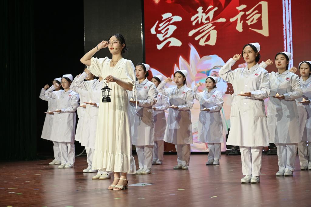 会上,护理学生通过舞蹈、礼仪展示、朗诵、合唱等多种形式进行庆祝,用精彩演出诠释护理人为爱坚守的崇高精神。大会在全场合唱《星辰大海》中落幕。