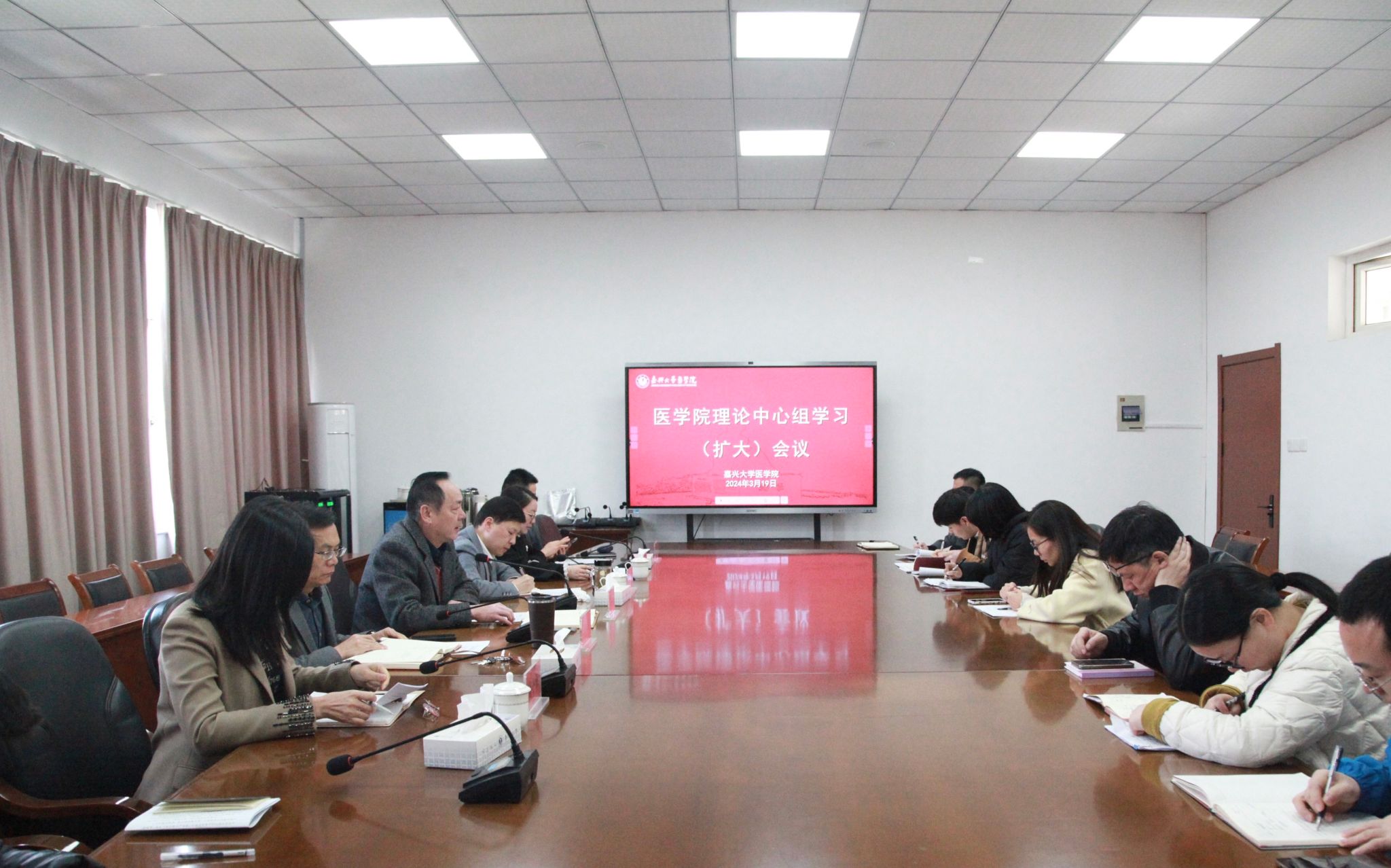 召开党委理论学习中心组(扩大)会议,深入学习习近平总书记在全国两会期间的重要讲话精神和十四届全国人大第二次会议精神、全国政协十四届第二次会议精神以及全省、全市、全校领导干部会议精神,并就学习贯彻作出工作部署。院党委书记陈云飞主持会议并讲话,院党委副书记朱莹领学“习近平总书记在全国两会期间的重要讲话精神和全国两会精神”,学院党政领导、党委委员、民主派代表、各党支部书记及思政辅导员参加会议。