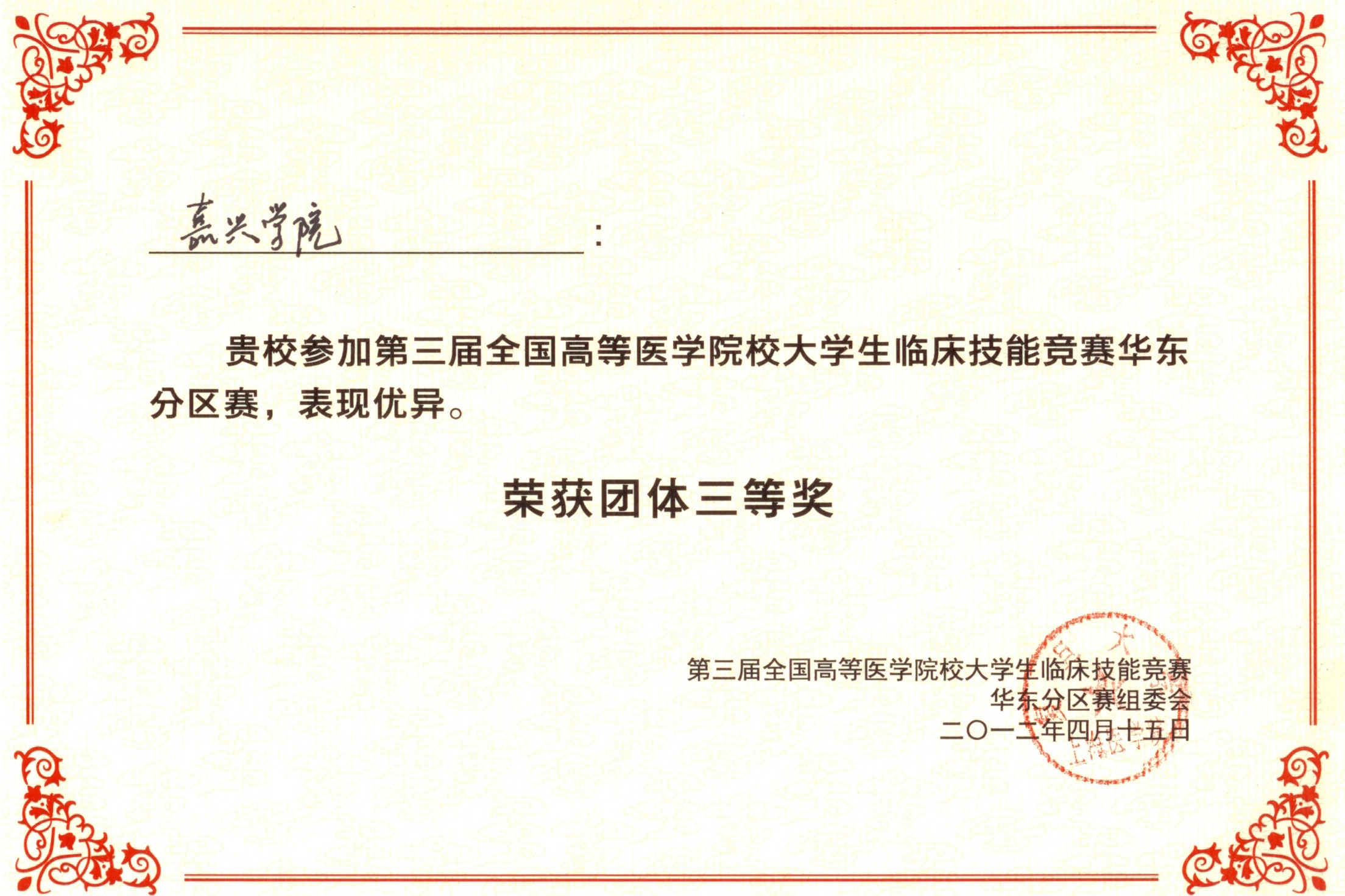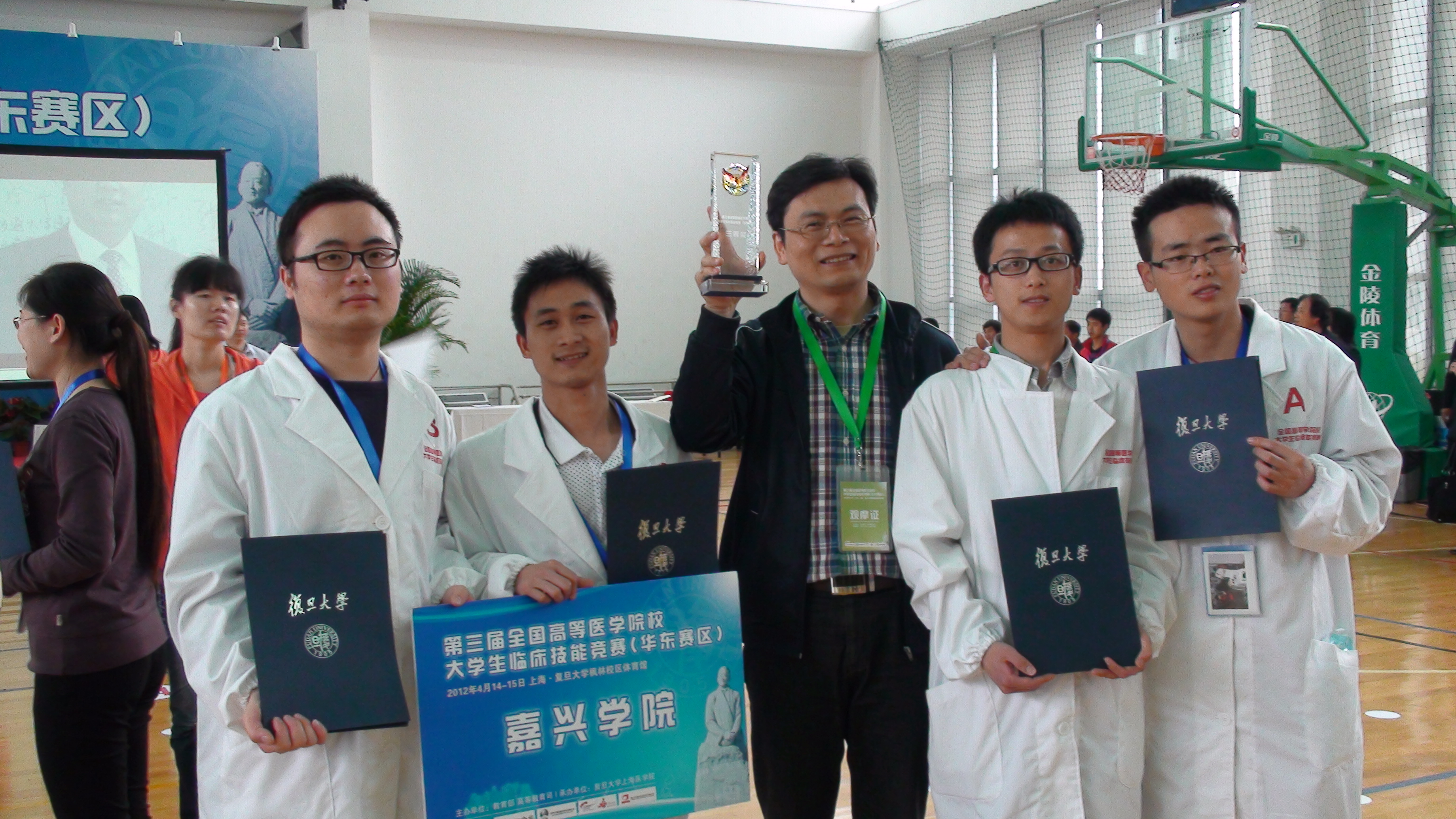 校大学生临床技能竞赛(华东赛区)在上海•复旦大学枫林校区举行,我校选派的07级临床医学专业学生顾超、李晓波、余俊华、陈幸四位同学参加了比赛,并最终在比赛中荣获团体三等奖。