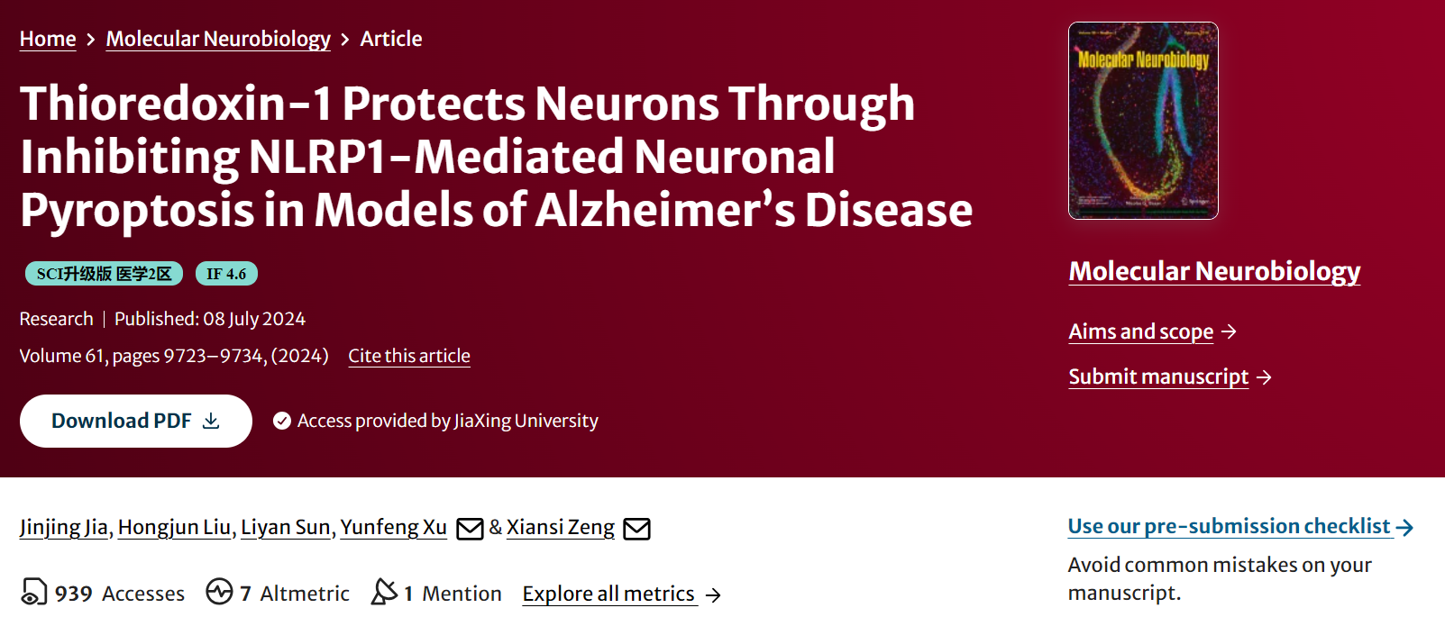 神经生物学团队在JCR Q1区 、中科院二区期刊Molecular Neurobiology上发表题为:Thioredoxin‑1 Protects Neurons Through Inhibiting NLRP1‑Mediated Neuronal Pyroptosis in Models of Alzheimer’s Disease的原创研究论文。贾金婧副教授为本论文第一作者,曾宪思副教授为通讯作者,嘉兴大学为第一单位和通讯单位。
