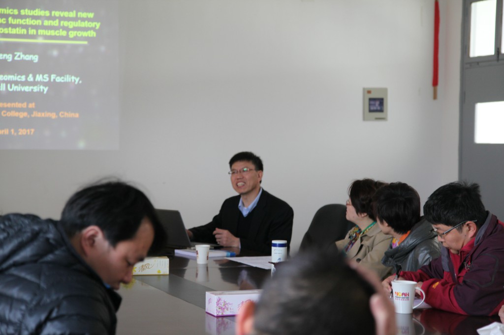 师生做了题为《Integrating multi-omics studies reveal new regulators of cardiac function and regulatory mechanisms of myostatin in muscle atrophy 》的学术报告,报告展示了目前世界最前沿的蛋白组学测试手段和质谱技术以及在医学等学科中的应用,并与在场师生进行了热烈的交流。报告具有很强的学科前沿性,在场师生开阔了视野,大家都认为受益匪浅。下午,张胜博士与爱迪影视