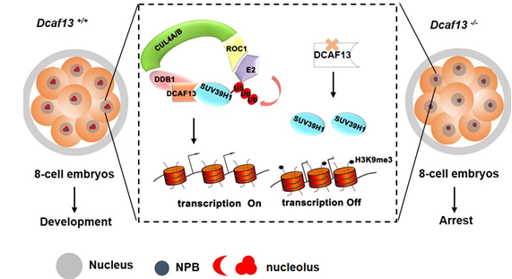 张银丽研究员提出了DCAF13除了常见的泛素化功能外的另一作用新形式——参与调控rRNA前体的剪切和核糖体小亚基的组装。通过其C末端的SOF1结构域结合核糖体RNA前体(pre-rRNA),和其他重要核糖体蛋白如fibrillarin、NOP56相互作用,从而参与pre-rRNA的剪切和核糖体小亚基的组装。张老师研究发现,敲除Dcaf13的卵母细胞中由于无法积累足够的rRNA和核糖体,使得细胞中整体蛋白合成水平下降,进一步影响发育成熟并排卵、受精的潜能。