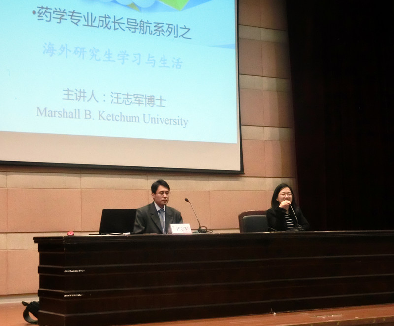 此次讲座的主题是药学专业成长导航系列之海外研究生学习与生活,目的是使有意向出国留学的药学专业学生对外国的生活与学习有所了解以便及早做准备,同时为其他学生拓展知识面。汪志军博士用幽默的语句向同学们介绍了什么是Z一代,吸引了同学们的注意力。随后,汪博士围绕着报考国外大学的条件与五个阶段、如何自我介绍、在国外学习需要克服的障碍以及所需要具备的能力等方面展开了演讲。汪博士特别提到,到国外时应注意安全第一,并介绍了如何定居在国外和取得定居资格的方法。最后,丁宝月博士提问汪博士留在国外的原因,对此汪博士用风趣的语言向大家讲述了自己的生活和国内外的差异。