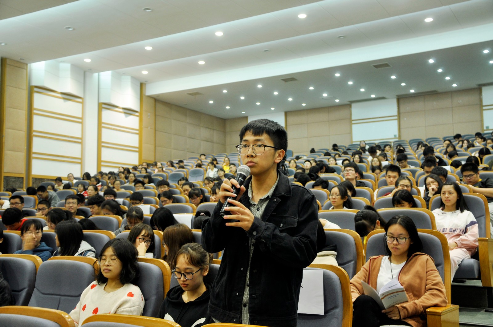 党委副书记任玉萍讲话十个环节。本次道德讲堂以省身拉开序幕,随着舒缓的音乐声响起,在主持人的引领下,全体人员进行了自我反省与合唱道德歌《歌唱祖国》;学模范讲故事环节,志愿者何缘运同学作为道德模范,向大家讲述了“红色精神探访”小队的故事,通过小视频,在场的老师、同学也深切感受到他们的志愿精神;“百川东到海,何时复西归?少壮不努力,老大徒伤悲”,一首《长歌行》让学生们在经典诵读中感受到了中华文化的无穷魅力。在行崇德礼过程中,全体人员以庄严肃穆的姿态面对“德”字深鞠一躬。临近结尾,主持人对全体人员发出倡议:希望有更多的人加入到志愿者行列中来,践行志愿者精神,从点滴做起。最后,任玉萍书记对学生们提出建议,她呼吁同学们做时间的主人,勤奋学习,勇于实践,早日成为祖国的栋梁之才。