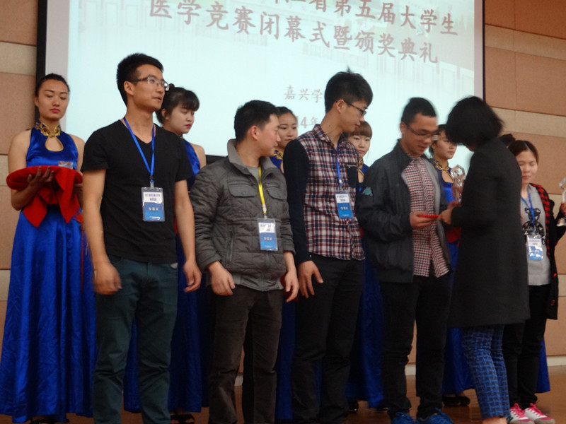 闭幕式在来宾们热烈的气氛中开始。主持人首先代表竞赛组组委会与秘书处向所有给予本次竞赛大力支持和帮助的领导、专家、老师和同学们表达衷心的感谢。之后,由王敏上台发言。王敏对本次大赛表达了充分的肯定,并总结出三个体会:各所高校对此次比赛的重视是大赛成功举办的重要原因;竞赛公平公正,沟通实时流畅保证了比赛的顺利进行;指导老师与参赛同学遵守比赛规则,体现其专业素养与技能水平。而方力争对选手们饱满热情的精神状态与严谨求实的参赛态度给予了肯定,并指出与国际相关竞赛接轨是此次比赛的一大特色,有利于学生拓展技能,提高实践水平,同时代表专家组表达了对精益求精的比赛追求。此次闭幕式的高潮由此开始,马文学宣布比赛成绩。本次大赛共设一等奖5名,二等奖12名,三等奖17名。嘉兴学院南湖学院两支队伍,嘉兴学院两支队伍与杭州师范大学一支队伍摘得桂冠。温州医科大学等12支队伍获得二等奖。台州学院等17支队伍获得三等奖。随后,举办了隆重的颁奖仪式,队伍代表们纷纷上台领奖,现场气氛热烈,每个人都面带着微笑,有的是一个个温馨的场面。