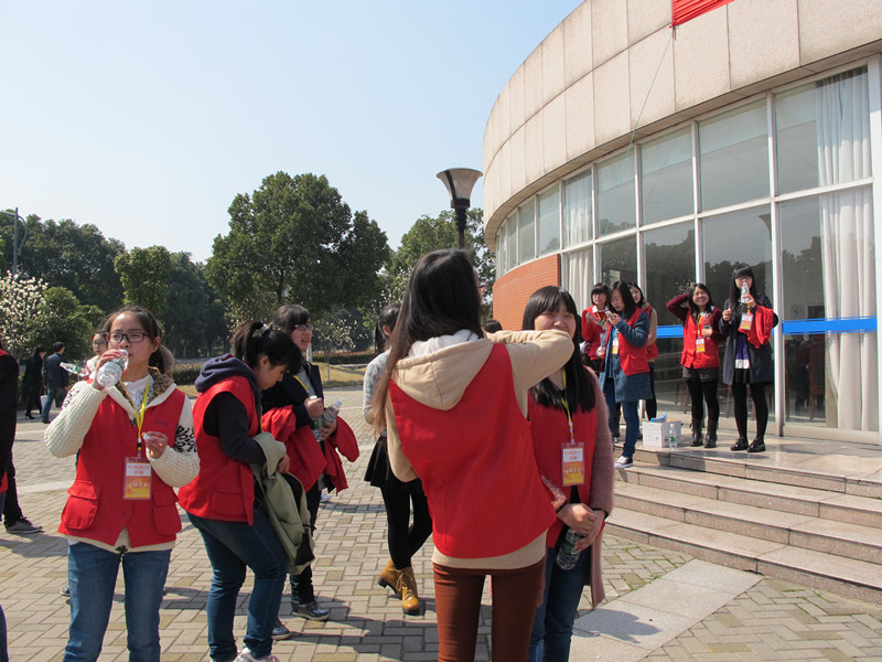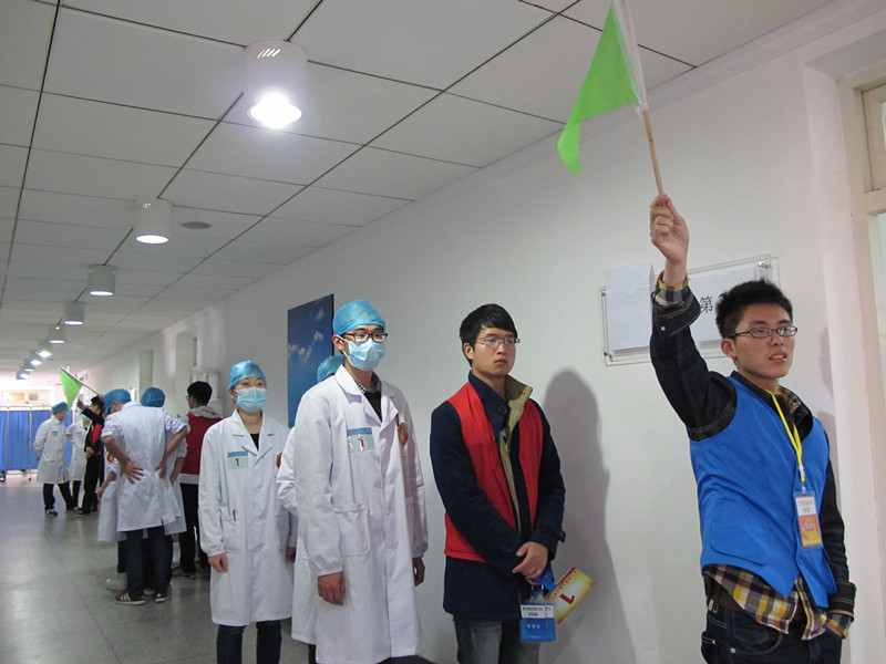 3月16号上午,“弘联杯”浙江省第五届大学生医学竞赛决赛在嘉兴学院梁林校区紧张的进行着。早上7点45分,志愿者们就集合在梁林校区医学实验中心大楼前的小广场。一批志愿者引导决赛队伍前往侯赛室,另一批志愿者则带领部分参赛队伍及领队老师前往1号楼的考试休息场地。决赛前,志愿者们有序的收取参赛队员的参赛证,并准时带领选手们步入相应考试站点。每站前都站着一个举旗志愿者,负责迅速将得分卡送至统分老师,同时有效维持场外纪律。志愿者们辛勤付出,为考场制造了一个良好环境。观摩场地中,志愿者们又布置了贴心的服务,及时为观看考场监控录像的老师及同学提供帮助。