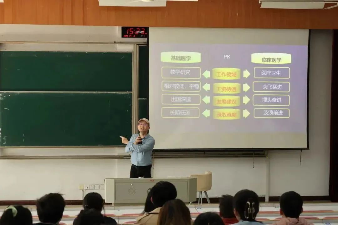 讲座以“解读医学考研的二三事”为题。杨净首先对基础医学与临床医学的就业方向进行比较,从工作领域、工资待遇、发展建议及录取难度入手,分析了两者优势;其次,重点解读了医学专业考研热门专业及院校选择,详细分析了每个学校的优劣势,并对学硕和专硕的区别进行了讲解。他还从试卷结构分析入手,就考研备考时间、复习规划等提出了建议。
