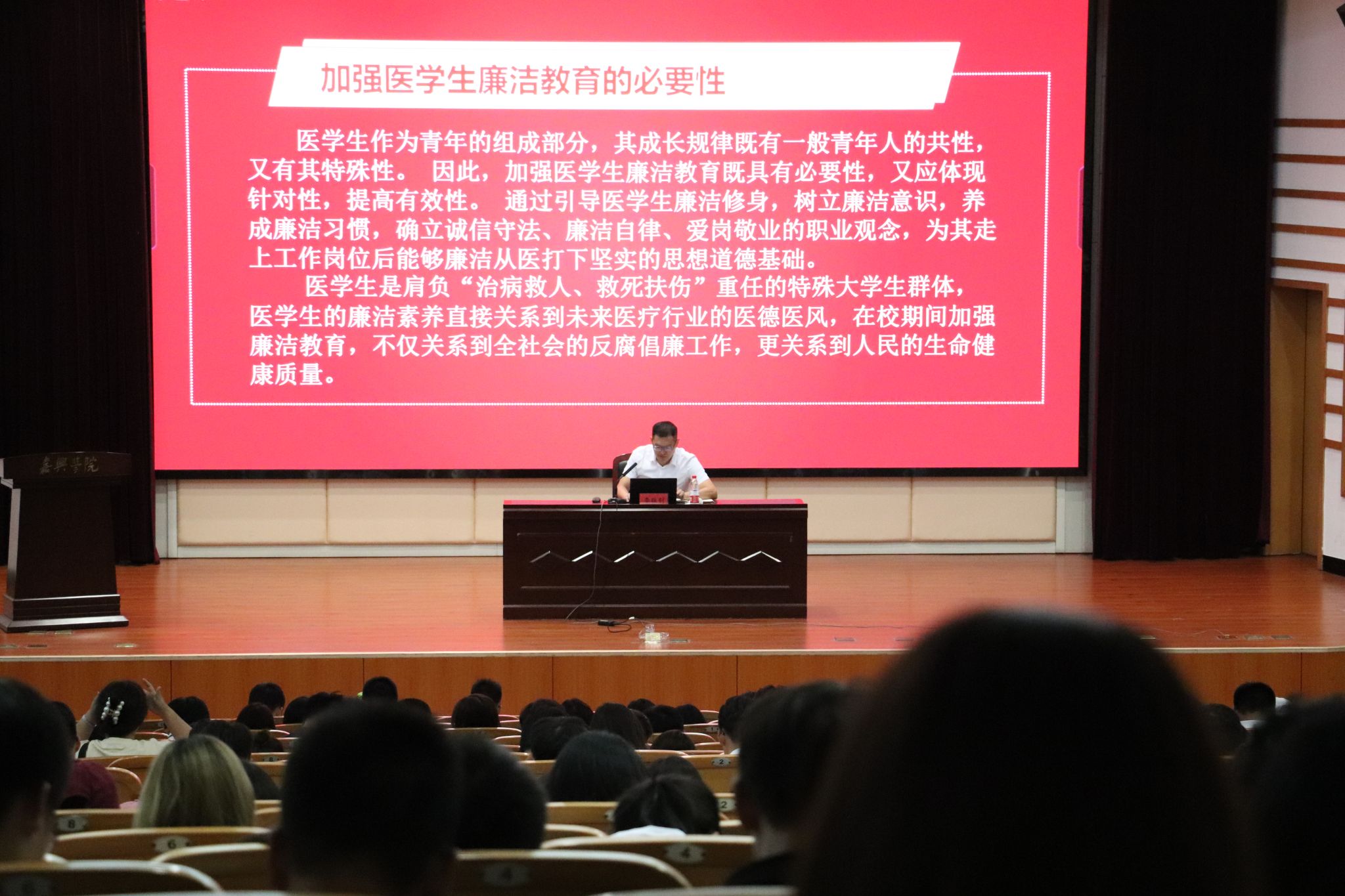 学院党委副书记李书记开展了以廉洁教育为主题的讲座。讲座以杏林典故,医学生誓言等方面讲了廉洁的重要性。强调了,在大学校园中,重要的不止是“学”,更是“德”,用清廉文化弘扬清廉精神。引导莘莘学子们积极向上,创造良好院风。
