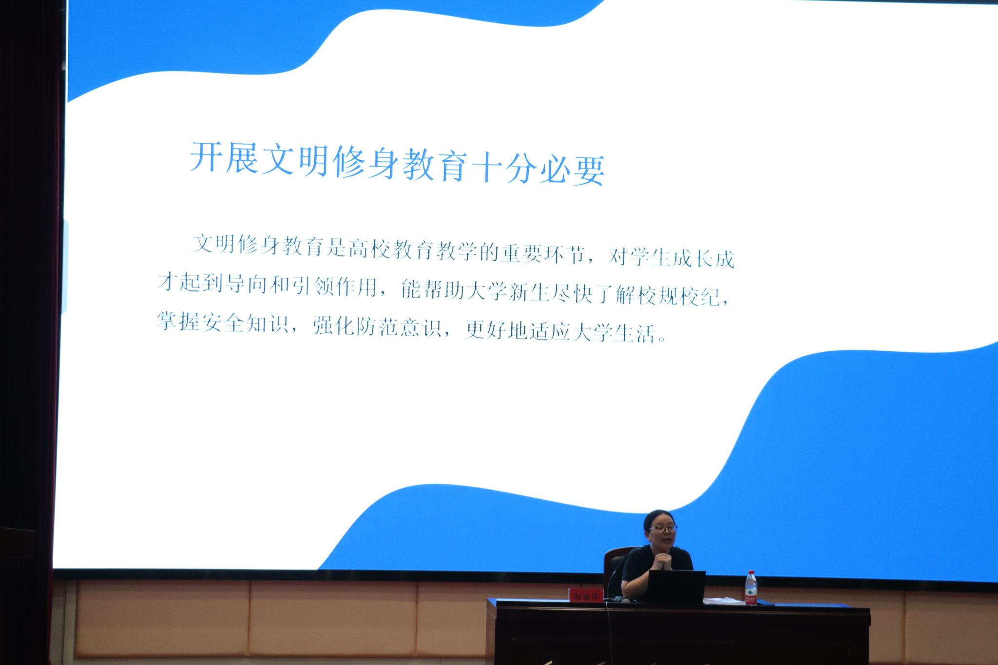 学工办主任赵丽萍老师为大家开展了文明修身教育。本次讲座包括了学生奖学金评定,学生评优办法,学生违纪处分规定,学生考试违纪认定及处理方法,还开展了交通安全、网络言行、寝室安全教育等,此次讲座帮助了新生尽快了解校纪校规,掌握安全知识,更好的适应大学生活。