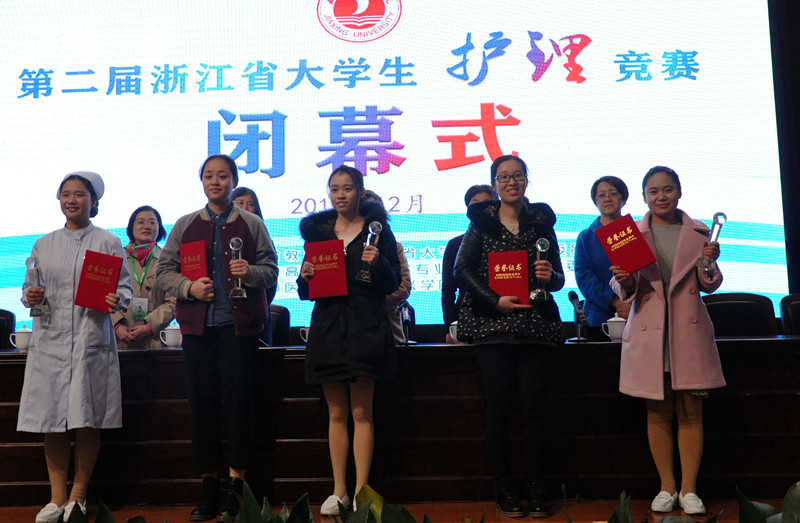 2016年12月10日到11日,第二届浙江省大学生护理竞赛在嘉兴学院举行。浙江省教育厅高教处副处长王国银,浙江省大学生护理竞赛委员会主任委员、浙江中医药大学党委书记孙秋华,嘉兴学院党委书记黄文秀等嘉宾和专家委员,以及各参赛队伍师生出席了10日的开幕式。本次竞赛决赛共有来自全省16所本科护理院校31支队伍参赛。经过两天激烈比赛,共产生5个团体一等奖,获奖团队分别为浙江中医药大学当归队、浙江中医药大学三七队、浙江中医药大学滨江学院燕羽心生队、浙江中医药大学滨江学院循路队、嘉兴学院嘉医-Running Girl队。5个团体二等奖,获奖团队分别为温州医科大学冲锋战队、温州医科大学白玉兰队、温州医科大学护动青春队、温州医科大学白衣展翅队、嘉兴学院Big Bang队。10个团体三等奖,获奖团队分别为湖州师范学院Dreamer队、湖州师范学院求真学院朝阳队、绍兴文理学院元培学院Lucky Clover队、杭州师范大学医见倾心队、绍兴文理学院完美组合队、湖州师范学院求真学院卓越队、湖州师范学院飞翔队、绍兴文理学院“V”笑之队、绍兴文理学院元培学院医路有爱队、嘉兴学院南湖学院Perfect Hands队。6个组织奖,获奖团体为嘉兴学院、浙江海洋大学、浙江中医药大学、温州医科大学、绍兴文理学院、湖州师范学院。