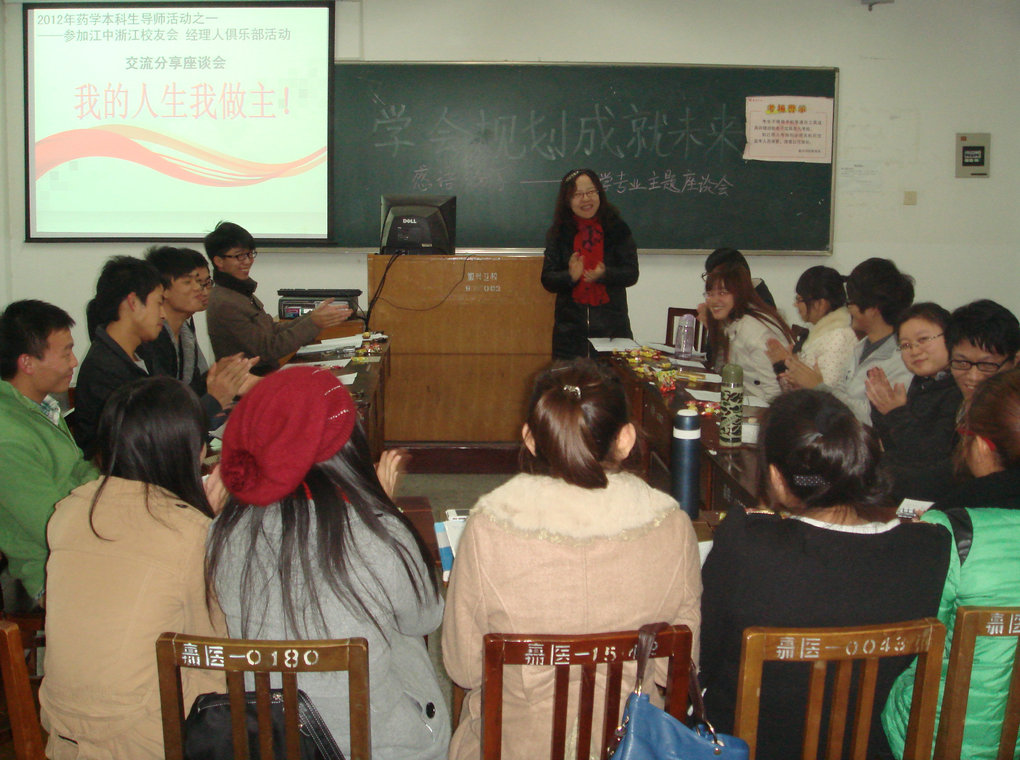 11月23日晚1号楼310教室灯火通明,药学专业20余名学生及老师在这里举行“学会规划,成就未来”的主题讨论会,同学们在轻松愉快的气氛下畅谈对人生规划,对未来的思考,对现状的分析,分享自己的心路历程。是什么让他们聚在一起,这样敞开心扉,有着对未来工作岗位崭新的思索?这要从一周前的杭州之行说起。