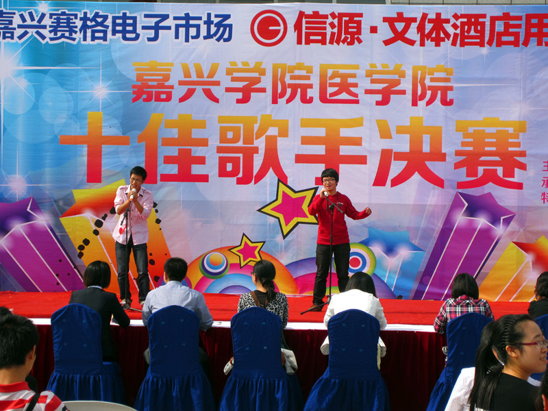 本次比赛的场地别出心裁的设在了赛格广场,前往观看的同学有200多人。各位选手神采奕奕,准备就绪,比赛分为4个环节,第一个环节选手根据抽签进行两两对唱,分数最低的4位选手进入危险区;第二个环节是独唱,有4位选手可直接进入决赛;第三环节选手根据抽签进行两两PK,6个直接进入决赛,6个淘汰;第四环节是危险区的4位选手可选择一位十强选手进行挑战。各个环节还穿插了艺术团的同学们带来的精彩演出。