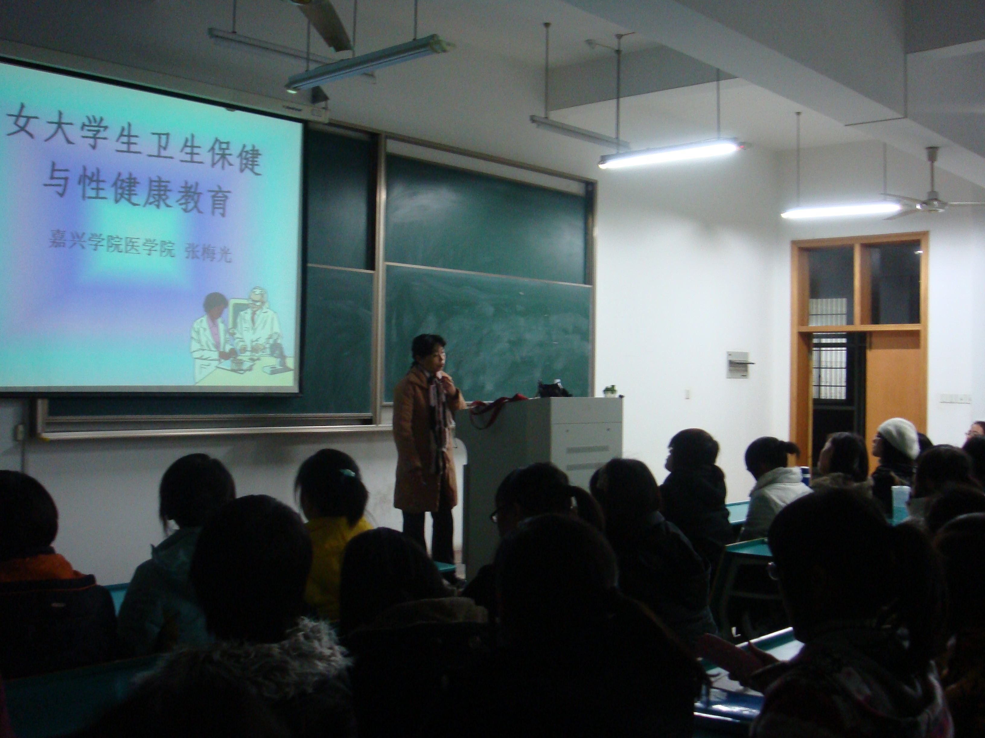 2009年12月16日18点40分在教五102,爱迪影视 学工办邀请任教《妇产科学》的张梅光老师,做了一场“女大学生卫生保健与性健康教育”的讲座,爱迪影视 2009级共180余名女生参加了此次讲座。