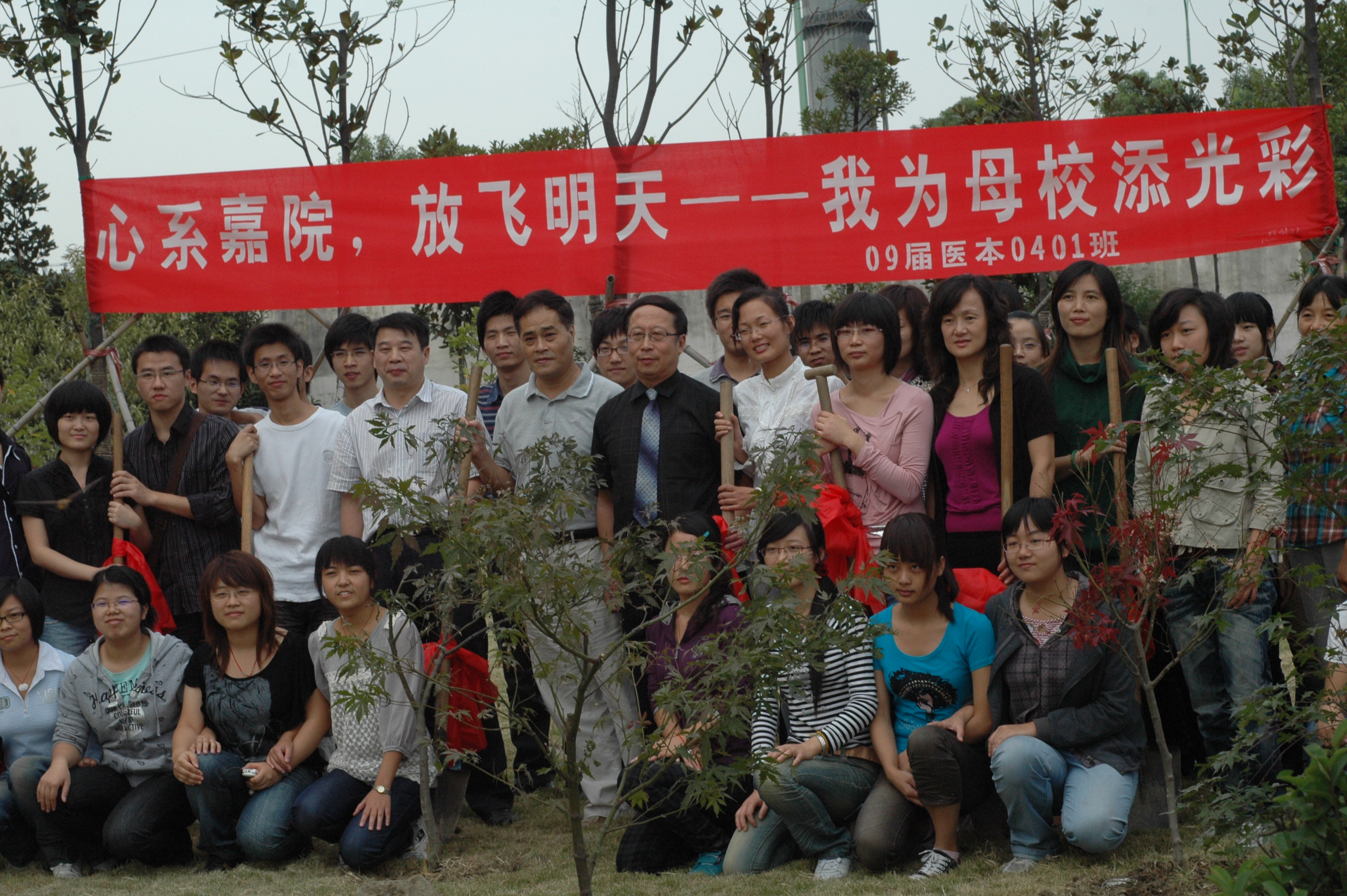 宋国杰院长、张杰书记、谢宏副书记、学工办蒋小红主任、0401班前班主任凌厉老师和6名毕业生代表以及部分在校各年级同学志愿参加了植树仪式。仪式中,原医本0401班长史陈萍发出了种植“校友林”的倡议,表达了对母校的深厚感情,并表示将通过自己的努力来回报母校,希望母校的未来越来越好!宋国杰院长代表学校对医本0401全班同学深情致辞,感谢他们对母校这份真诚的感情和对母校的报答与祝愿,告诉他们母校和他们互相是永远的印记和牵挂,母校将一如既往期待着、关注着他们,永远爱他们。热烈、感动、欢快掺杂一丝感慨怅惘的气氛中,师生们并肩列队在刚刚种下的小树林前合影,写下了学院历史上动人的一页。