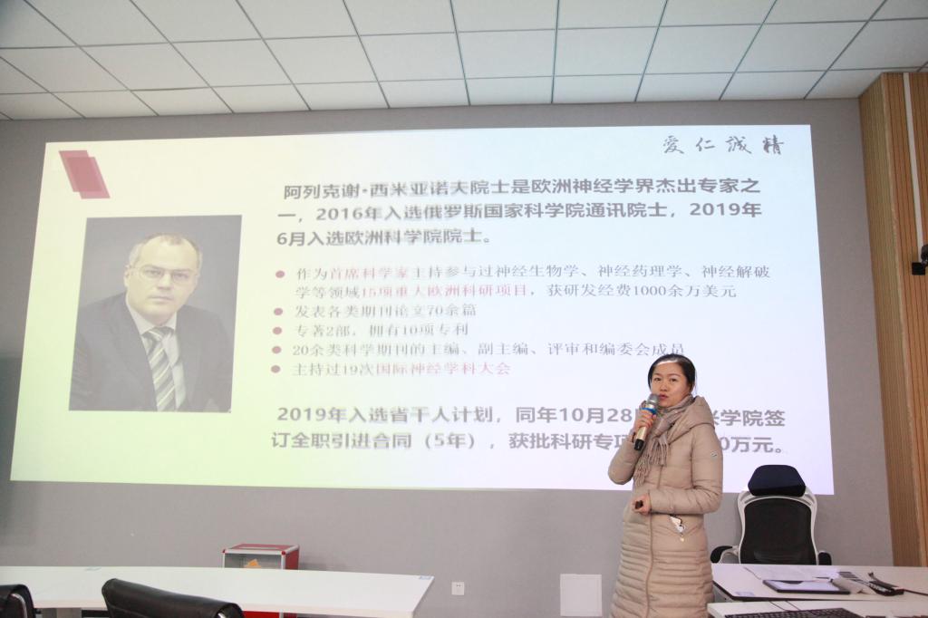 会上,神经生物学研究团队、医工创新科学研究团队和肿瘤光动力疗法及其靶向药物研究团队的专家负责人阿列克谢院士、程树群教授、迈克·海格教授通过视频形式对各自团队做了推介。团队联系人李丽、潘巍巍、丁宝月三位教授详细介绍了团队的概况、研究方向、实验室建设和岗位需求等情况,与有意向加入团队的教师进行了深入交流,后经报名申请,专家面试,最终确定了团队候选人名单。