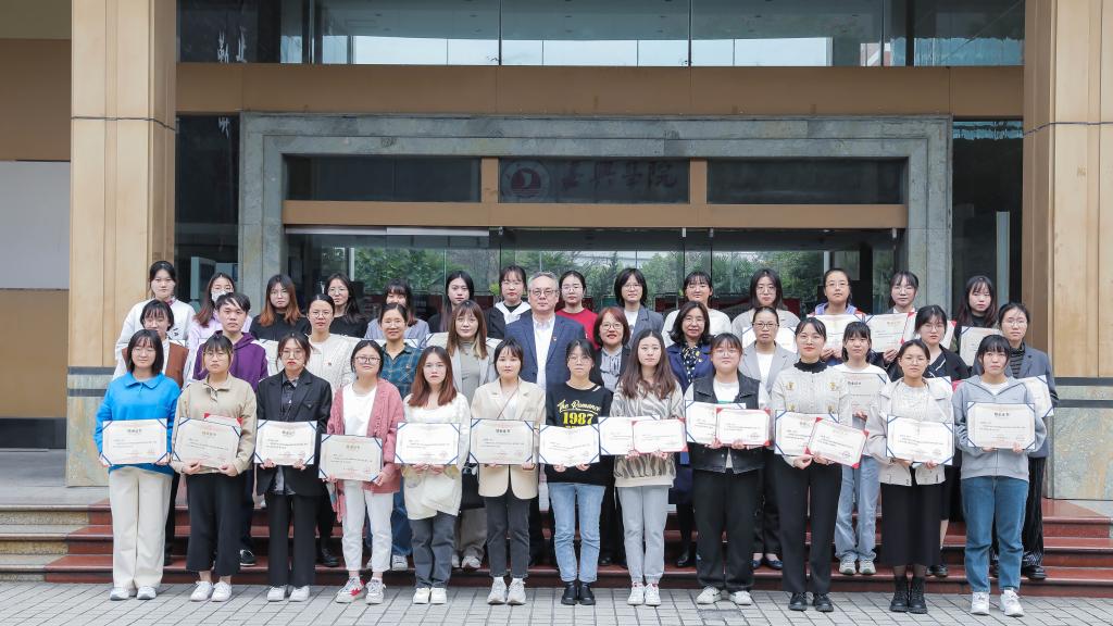 优秀学生代表王群、蒋盼两位同学在会上分享了自己在实验班学习和实训的体会和收获。圣方医药的化甜甜经理为第五期优秀学员颁发了太美奖学金。学院领导们为第五期学员颁发了结业证书,并合影留念。