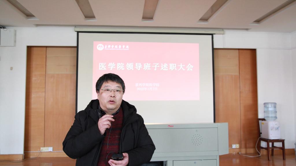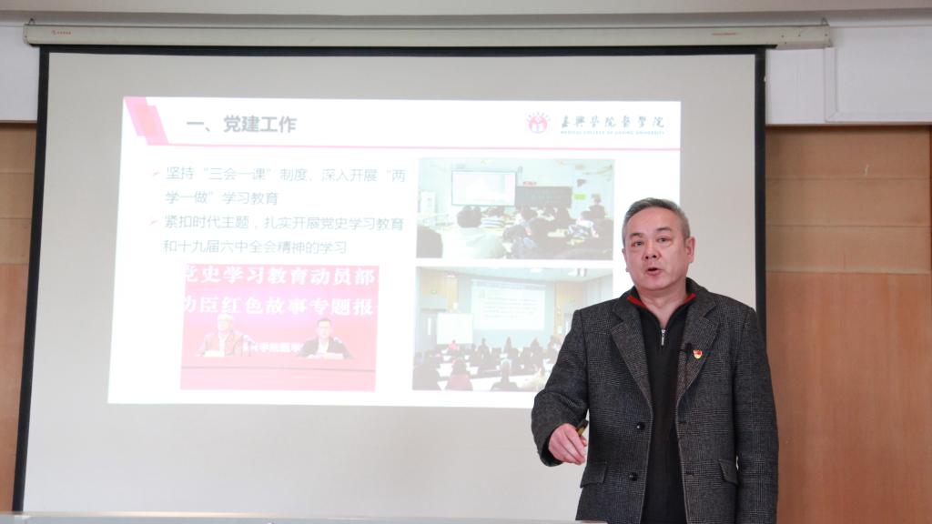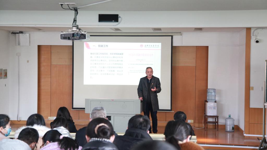 党政班子向全体教职工作学院2021年度工作汇报,陈云飞从党建工作、教学工作、学科建设与科研、师资队伍建设、学生工作等五个方面进行了汇报。