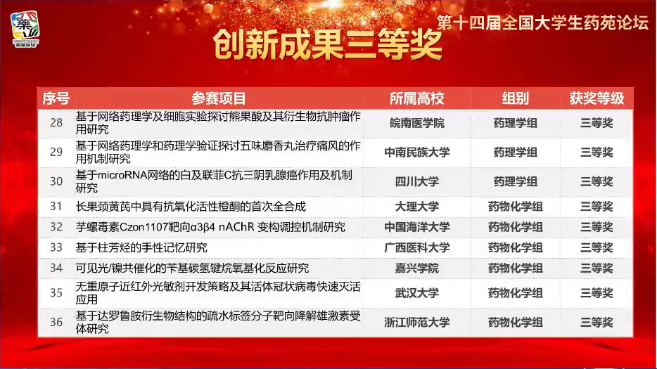 药学20级李驰同学团队(指导老师:吴霁蓂/高广春)获创新成果二等奖,药学20级贾雨琪同学团队(指导老师:刘石惠/黄越燕)获创新成果三等奖,参赛学生们在比赛中充分展现了我校学生优良的精神风貌与综合素质。