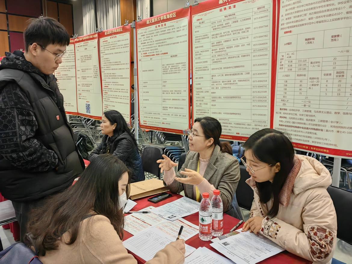 三位老师在嘉兴学院的招聘海报前向前来咨询的硕博士人才介绍嘉兴学院的基本情况,解答他们的疑问,与他们进行沟通和交流。