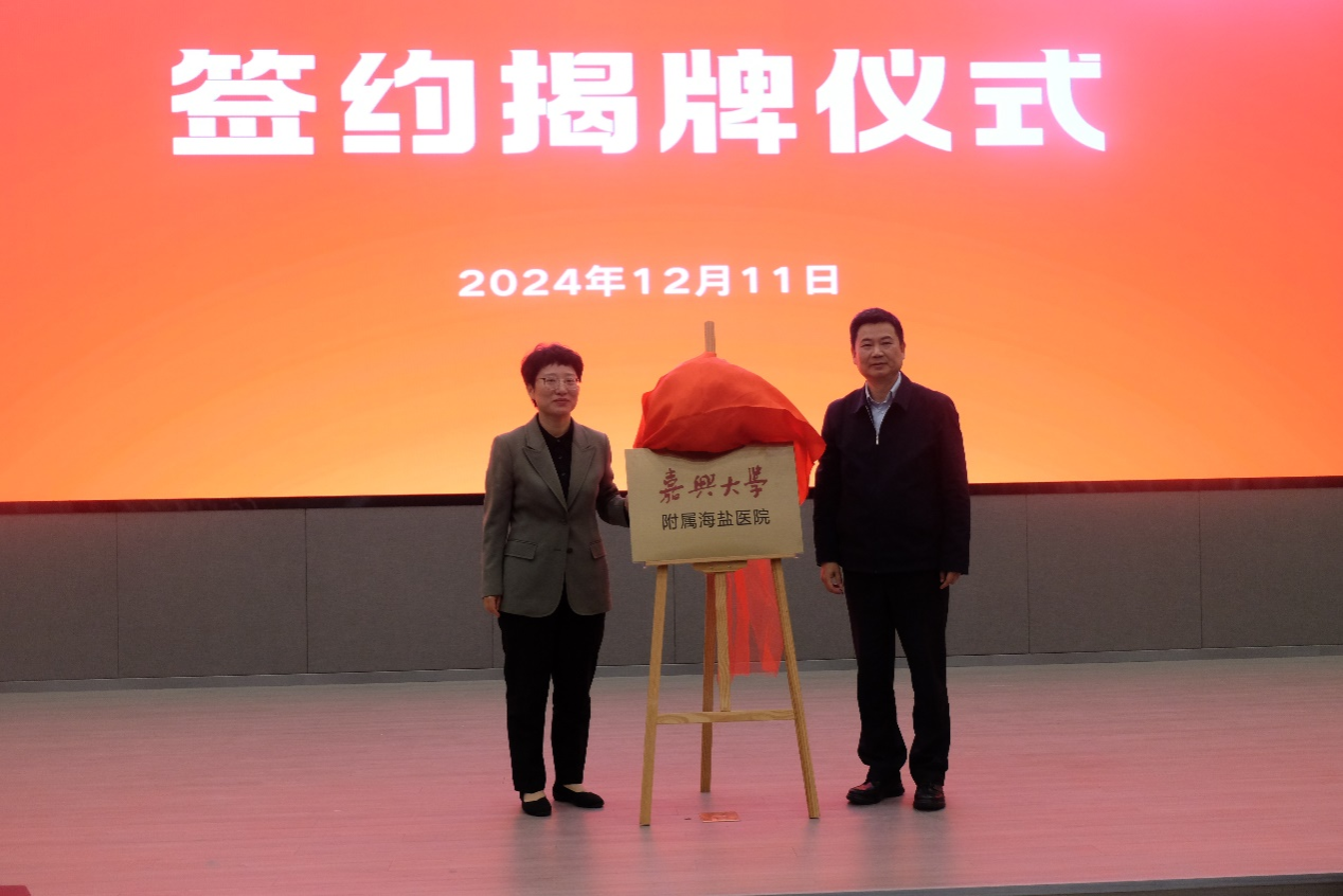 党委书记沈希,党委委员、副校长(主持日常工作)张琦,海盐县委副书记、海盐县人民政府县长顾秋莉等出席仪式。海盐县人民医院党委书记马小董主持揭牌仪式。