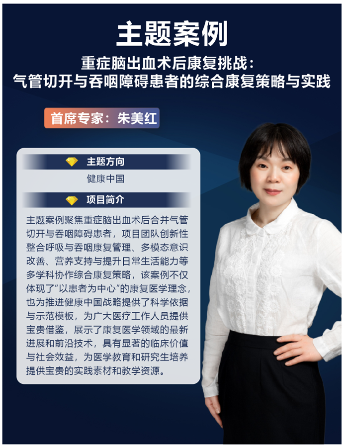 护理学专业研究生导师朱美红老师主题案例《重症脑出血术后康复挑战:气管切开与吞咽障碍患者的综合康复策略与实践》成功入选“健康中国”方向。