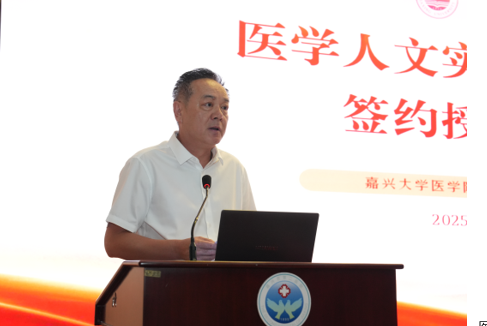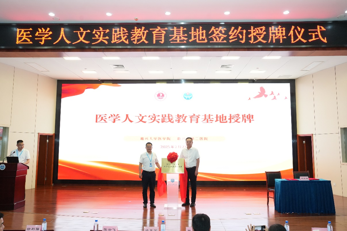 党委书记陈云飞与嘉兴市第二医院党委书记梁慧军共同签署了《医学人文实践教育基地协议书》,并完成了授牌仪式。